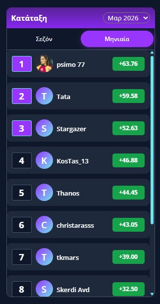 Σου θυμίζουμε πως μπορείς να τσεκάρεις καθημερινά την κατάταξη της σεζόν και του μήνα για να γνωρίζεις πού βρίσκεσαι.
